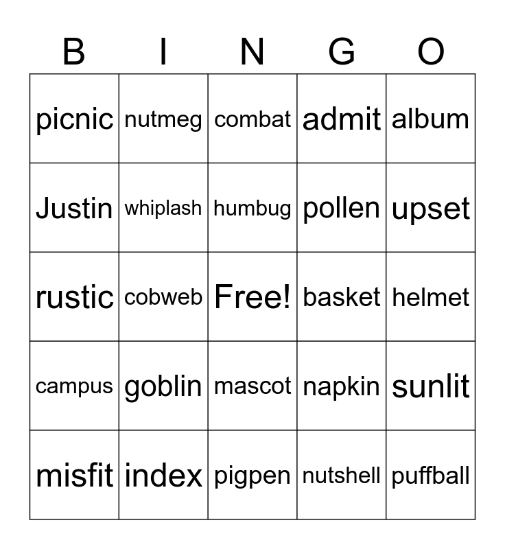 This bingo card has a free space and 28 words: sunlit, publish, pollen, nutshell, Justin, combat, nutmeg, campus, basket, misfit, rustic, admit, index, pigpen, upset, Calvin, goblin, whiplash, humbug, mascot, picnic, tablet, puffball, cobweb, helmet, napkin, album and until.