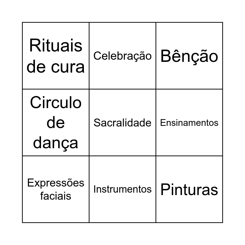 This bingo card has 68 words: Ritual, Tradição, Pajé, Canto, Tambores, Movimento, Celebração, Espiritualidade, Instrumentos, Coreografia, Comunidade, Cultura, Vestimentas, Sacralidade, Herança, Ensinamentos, Conexão, Rituais de cura, Respeito, Ancestralidade, Pinturas, Roda de dança, Integração com a natureza, Danças de fertilidade, Festivais, Renovação, Espaço sagrado, Reverência aos antepassados, Fluidez, Ritos de passagem, Bênção, Movimentos rituais, Danças cerimoniais, Gratidão, Circulo de dança, Espontaneidade, Adornos, Vínculo com a terra, Tambor, Batidas, Saltos, Cantos sagrados, Expressões faciais, Aquecimento, Reverência aos espíritos, Roda de cura, Sincronização, Narrativas ancestrais, Índios, Dança, singularidade, Expressão, Costumes, Estilo, Adereços, Indígena, Performance, Dançarinos, Ritmo, Expressão, Coordenação, História, Som, Diversidade, Música, Natureza, Batuque and gingado.