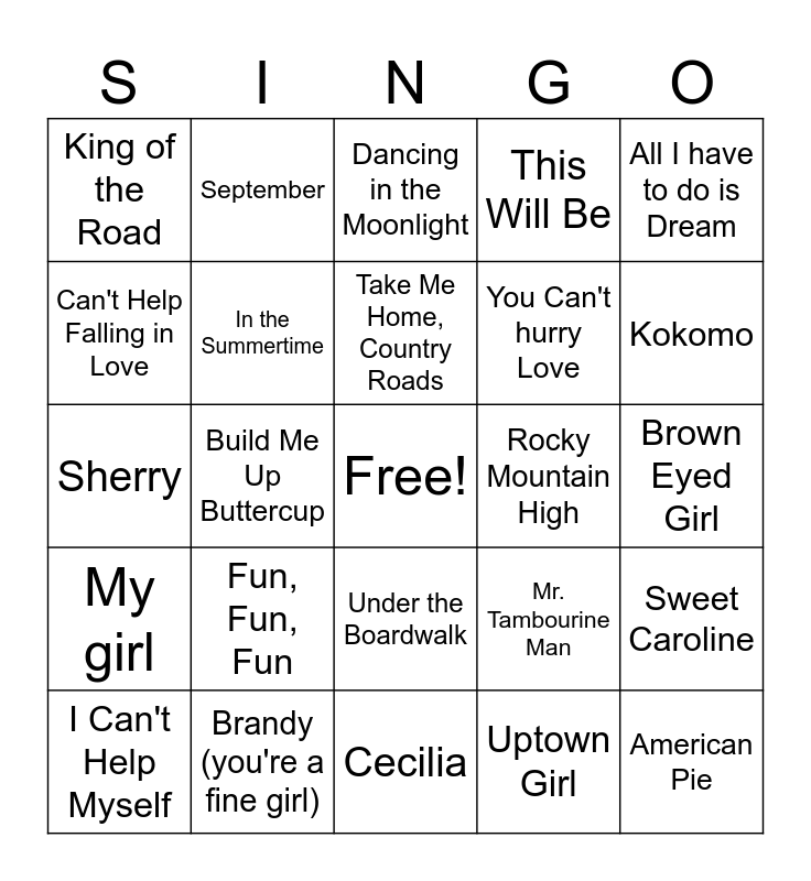 This bingo card has a free space and 29 words: I Can't Help Myself, Boogie Shoes, Build Me Up Buttercup, Midnight Train to Georgia, King of the Road, Dancing in the Moonlight, In the Summertime, Fun, Fun, Fun, Rocky Mountain High, Brandy (you're a fine girl), Brown Eyed Girl, American Pie, Cecilia, Uptown Girl, Kokomo, Sunshine of your love, Under the Boardwalk, My girl, All I have to do is Dream, Sherry, Mr. Tambourine Man, California Dreamin', You Can't hurry Love, Can't Help Falling in Love, This Will Be, September, Sweet Caroline, Take Me Home, Country Roads and Hooked on a Feeling.