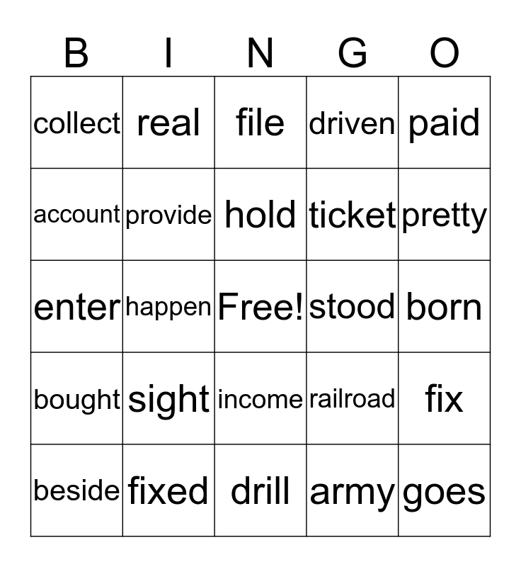 This bingo card has a free space and 29 words: beside, teach, happen, begun, collect, file, provide, sight, stood, fixed, born, goes, drill, army, pretty, stole, income, bought, paid, enter, railroad, unable, ticket, account, driven, real, fix, hold and go.