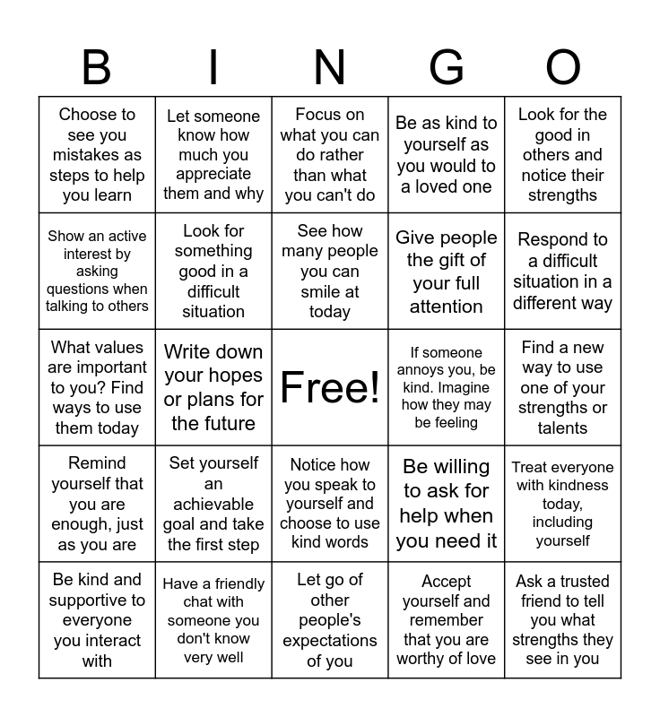 This bingo card has a free space and 29 words: Be kind and supportive to everyone you interact with, Take five minutes to sit still and just breathe, Write down your hopes or plans for the future, Make a list of ways you can support a friend or family member, Choose to see you mistakes as steps to help you learn, Focus on what you can do rather than what you can't do, Look for something good in a difficult situation, Set yourself an achievable goal and take the first step, If someone annoys you, be kind. Imagine how they may be feeling, Have a friendly chat with someone you don't know very well, Find a new way to use one of your strengths or talents, Ask a trusted friend to tell you what strengths they see in you, Let go of other people's expectations of you, Accept yourself and remember that you are worthy of love, Respond to a difficult situation in a different way, Make choices that have a positive impact for others today, Notice how you speak to yourself and choose to use kind words, Remind yourself that you are enough, just as you are, Look for the good in others and notice their strengths, What values are important to you? Find ways to use them today, Be willing to ask for help when you need it, Say hello to a neighbor and get to know them better, Give people the gift of your full attention, Show an active interest by asking questions when talking to others, Be as kind to yourself as you would to a loved one, Let someone know how much you appreciate them and why, Treat everyone with kindness today, including yourself, See how many people you can smile at today and Send a message let someone you know you're thinking of them.