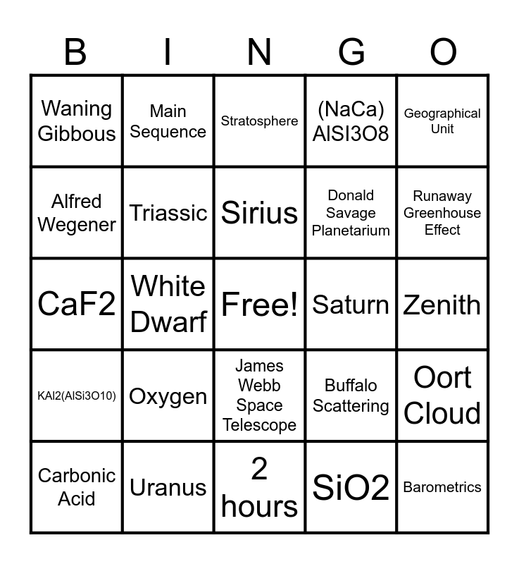 This bingo card has a free space and 203 words: Au, Ag, Hg, Gd, 10,000 - 12,000 years ago, 1,000 - 1,200 years ago, 5,000 - 6,000 years ago, Schlurp, Whitworth Ferguson Planetarium, Donald Savage Planetarium, Less, More, Sunlight Reflection, Moonlight Reflection, Earthlight Reflection, 75000 gallons, 25000 gallons, 100000 gallons, One, One Billion, 200K, Polar, Nonpolar, Jupiter, Uranus, Saturn, Neptune, Rayleigh Scattering, Buffalo Scattering, Newfane Scattering, Hydrochloric Acid, Carbonic Acid, Sulfuric Acid, Oblate spheroid, Prolate Spheroid, Hydra, Cancer, Aries, Ursa Major, Cassiopeia, Jack Hills, 4.4 bya, Lake Huron, Lake Ontario, Lake Michigan, Lake Erie, Lake Superior, Precambrian, Paleozoic, Mesozoic, Cenozoic, (NaCa) AlSI3O8, CaF2, KAl2(AlSi3O10), Titan, SiO2, Sedimentary, Igneous, Metamorphic, Geographic Information Systems, Anthracite, Bituminous, Peat, Lignite, 1885, 1985, 1785, 25 km, 16km, 11km, Shale, Slate, Alfred Wegener, Stephen Vermette, Vesicles, 3 hours, 2 hours, 24 hours, Compounds of Elements, Plastics of Legos, Dissolved salt content of a body of water, Sahlen Hotdog Content, O3, O2, O4, Mainly Silicon and Oxygen, Potassium and Argon, Iron and nickel, 20%, 97%, 2%, Wisconsinan Glacial Stage, Michigan Glacial Stage, Bronx Glacial Stage, Adirondacks, Antarctica, Gobi, Sahara, Nitrogen, Oxygen, Argon, Sirius, Polaris, Zenith, 23.5 degrees, 43 degrees, 90 degrees, Waning Gibbous, Waxing Gibbous, New Moon, Troposphere, Stratosphere, Mesosphere, Thermosphere, Muscovite and Biotite, Phlogopite, Lepidolite, Pahoehoe and A’a, Coo’s Canyon, Grand Canyon, Pirates of the Canyon, Chicxulub crater, Yucatan Crater, Lithosphere, Asthenosphere, Astronomical Unit, Metric Unit, Geographical Unit, Pacific Ocean, Atlantic Ocean, Indian Ocean, James Webb Space Telescope, Hubble Space Telescope, Einstein Probe Space Telescope, Olympus Mons, Mauna Kea, Mount Everest, Quartz and Feldspar, Pyroxene and Cobalt, Convergent, Divergent, Transform, 4.6 billion years old, 3.4 billion years old, 2024 years old, Oort Cloud, Short Cloud, Kuiper’s Cloud, Diamond, Corundum, Topaz, Quartz, Eurypterus Remipes, Sussyus Amongus, Eubrontes giganteus, Carbon, Helium, Magnesium, April 8th, 2024, April 7th, 2024, The Big Bang Theory, The Big Expansion Theory, The Outreaching Universe Theory, Eternal Flames Falls, Niagara Falls, American Falls, Astrology, Astrobiology, Astrometry, Astrophysics, Runaway Greenhouse Effect, Runaway Venus Effect, Mt. St. Helens, Mt. Rainier, Mount Spurr, Mt. St. Augustine, Invertebrate paleontology, Vertebrate paleontology, CaCO3, MgSO4, CFCl4, CCl2F2, CF4, SF6, Migmatites, Paleomagnetism, Aerodynamics, Barometrics, Thermodynamics, Paleotempestology, Paleoclimatology, Barometry, Cretaceous, Jurassic, Triassic, Main Sequence, White Dwarf, Super Giant, Bathymetry, Algology, Hydrobiology, Log-jam schist and Greenschists.