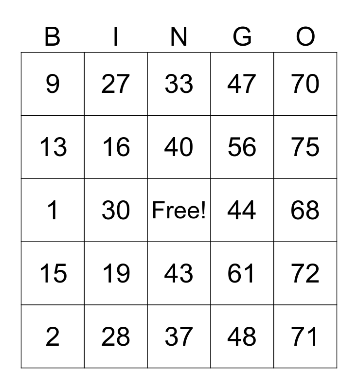 This bingo card has a free space and 24 words: 2, 19, 40, 48, 70, 9, 27, 33, 44, 68, 1, 16, 61, 72, 13, 28, 37, 47, 75, 15, 30, 43, 56 and 71.