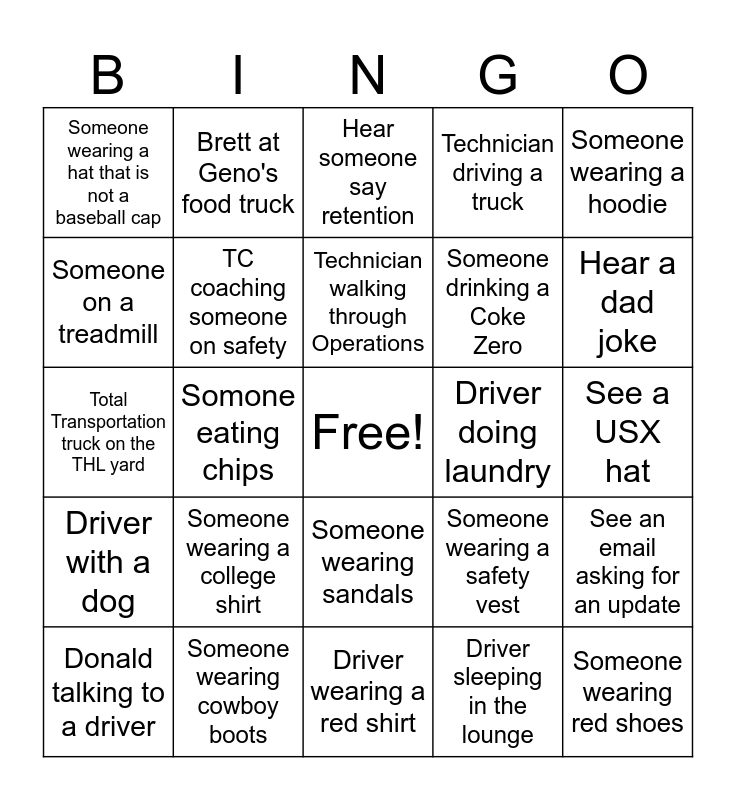 This bingo card has a free space and 24 words: Someone wearing a college shirt, Someone wearing cowboy boots, Technician walking through Operations, Donald talking to a driver, Someone wearing a hoodie, Someone wearing a hat that is not a baseball cap, Someone on a treadmill, Brett at Geno's food truck, Driver doing laundry, Someone wearing sandals, Someone drinking a Coke Zero, Total Transportation truck on the THL yard, Someone wearing a safety vest, See an email asking for an update, TC coaching someone on safety, Driver sleeping in the lounge, See a USX hat, Hear someone say retention, Hear a dad joke, Somone eating chips, Someone wearing red shoes, Driver with a dog, Technician driving a truck and Driver wearing a red shirt.