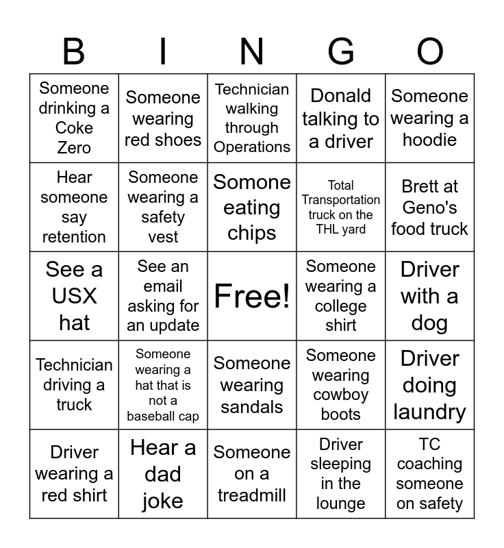 This bingo card has a free space and 24 words: Someone wearing a hat that is not a baseball cap, Hear a dad joke, Somone eating chips, Driver wearing a red shirt, Someone wearing a hoodie, Someone drinking a Coke Zero, Hear someone say retention, Someone wearing red shoes, Someone wearing a college shirt, Someone wearing sandals, Total Transportation truck on the THL yard, See a USX hat, Someone wearing cowboy boots, Driver doing laundry, Someone wearing a safety vest, Driver sleeping in the lounge, Driver with a dog, Technician walking through Operations, Brett at Geno's food truck, See an email asking for an update, TC coaching someone on safety, Technician driving a truck, Donald talking to a driver and Someone on a treadmill.