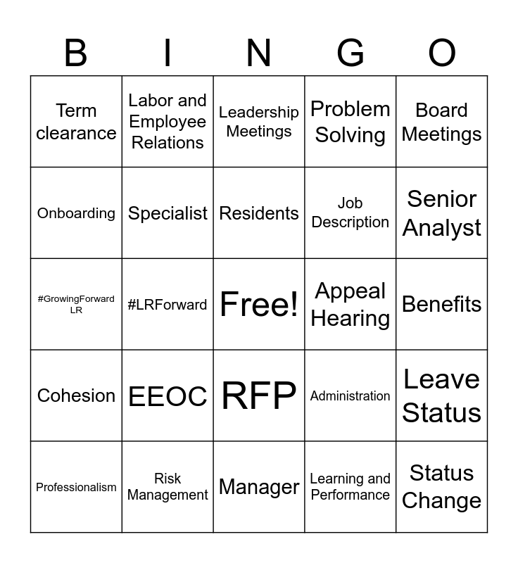 This bingo card has a free space and 59 words: CPO, Risk Management, EAP Referral, Cohesion, Learning and Performance, Unite, Specialist, LTD, Job Description, Offboarding, Problem Solving, People Centered, Onboarding, Reconciliations, Non-Uniform, Term clearance, Status Change, Board Meetings, Safety Sensitive List, Residents, Appeal Hearing, Leadership Meetings, Professionalism, Leave Status, Orientation, Innovation, Team Work, Call Payroll, Senior Analyst, Workers Comp, Coordination, ADA, Job Reclass, Grow, Labor and Employee Relations, Coordinator, Open enrollment, #LRForward, #LittleRock, #GrowingForward LR, Training, EEOC, Benefits, STD, Union Meetings, Classifications, Wellness Event, Serve, RFP, Manager, Equity, Teams, Bid Process, IOD, CAT leave, Administration, Progress, Exceptional Service and Skip level Meetings.
