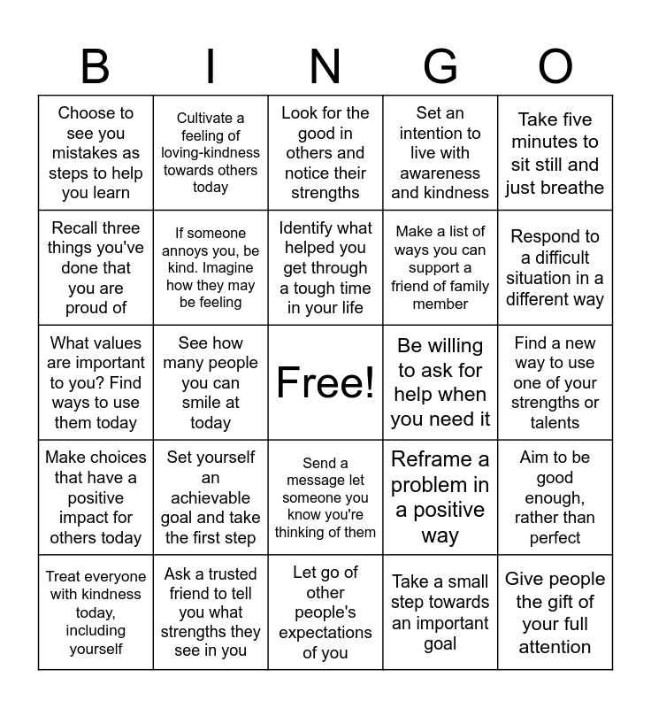 This bingo card has a free space and 29 words: Treat everyone with kindness today, including yourself, Look for something good in a difficult situation, See how many people you can smile at today, Notice how you speak to yourself and choose to use kind words, Choose to see you mistakes as steps to help you learn, Look for the good in others and notice their strengths, If someone annoys you, be kind. Imagine how they may be feeling, Set yourself an achievable goal and take the first step, Be willing to ask for help when you need it, Ask a trusted friend to tell you what strengths they see in you, Find a new way to use one of your strengths or talents, Give people the gift of your full attention, Let go of other people's expectations of you, Take a small step towards an important goal, Respond to a difficult situation in a different way, Connect with someone near you - share a smile or chat, Send a message let someone you know you're thinking of them, Make choices that have a positive impact for others today, Take five minutes to sit still and just breathe, What values are important to you? Find ways to use them today, Reframe a problem in a positive way, Listen deeply to someone and really hear what they are saying, Make a list of ways you can support a friend of family member, Recall three things you've done that you are proud of, Set an intention to live with awareness and kindness, Cultivate a feeling of loving-kindness towards others today, Aim to be good enough, rather than perfect, Identify what helped you get through a tough time in your life and Check in with someone who may be lonely or feeling anxious.