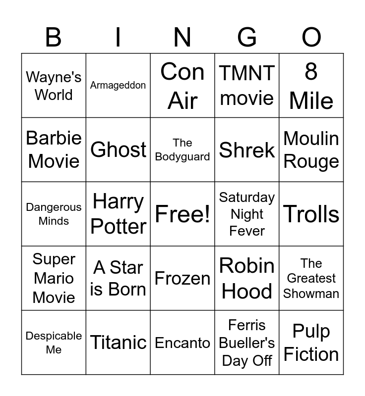 This bingo card has a free space and 24 words: A Star is Born, Titanic, The Bodyguard, Despicable Me, 8 Mile, Wayne's World, Barbie Movie, Armageddon, Saturday Night Fever, Frozen, Shrek, Dangerous Minds, Robin Hood, The Greatest Showman, Ghost, Ferris Bueller's Day Off, Trolls, Con Air, Moulin Rouge, Harry Potter, Pulp Fiction, Super Mario Movie, TMNT movie and Encanto.