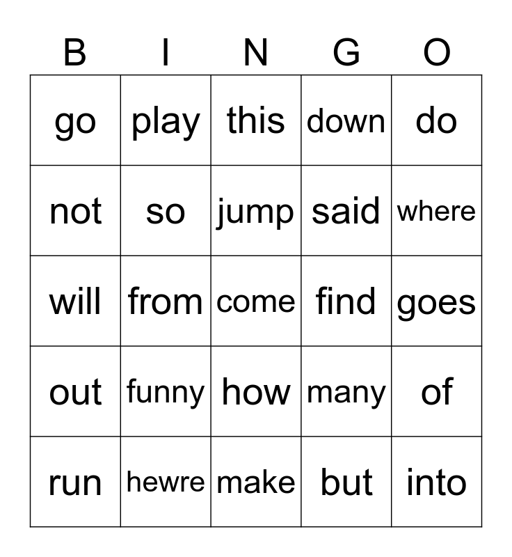 This bingo card has a free space and 24 words: funny, hewre, jump, run, do, go, not, play, find, how, said, will, many, of, so, but, goes, this, where, from, into, out, down and make.