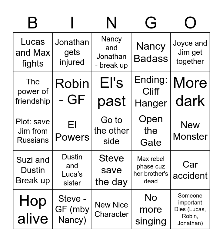 This bingo card has a free space and 29 words: Hop alive, Will - BF, El Powers, El/Mike have an romantic interest, Lucas and Max fights, Nancy and Jonathan - break up, Robin - GF, Dustin and Luca's sister, Open the Gate, Steve - GF (mby Nancy), New Monster, Someone important Dies (Lucas, Robin, Jonathan), New Nice Character, No more singing, More dark, Will have some powers, Steve save the day, Suzi and Dustin Break up, Joyce and Jim get together, Plot: save Jim from Russians, Max rebel phase cuz her brother's dead, Dustin & Lucas - fight, Ending: Cliff Hanger, The power of friendship, Nancy Badass, Jonathan gets injured, Car accident, El's past and The Theory guy is back.
