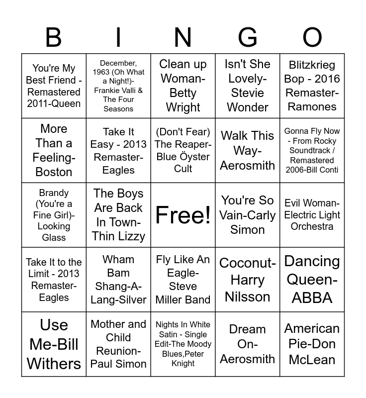 This bingo card has a free space and 67 words: Don't Go Breaking My Heart-Elton John,Kiki Dee, Play That Funky Music-Wild Cherry, Love Hurts-Nazareth, Dancing Queen-ABBA, You Should Be Dancing-Bee Gees, If You Leave Me Now-Chicago, December, 1963 (Oh What a Night!)-Frankie Valli & The Four Seasons, Golden Years - 2016 Remaster-David Bowie, (Don't Fear) The Reaper-Blue Öyster Cult, 50 Ways to Leave Your Lover-Paul Simon, Fly Like An Eagle-Steve Miller Band, Crazy On You-Heart, Evil Woman-Electric Light Orchestra, Blitzkrieg Bop - 2016 Remaster-Ramones, Cherry Bomb-The Runaways, More Than a Feeling-Boston, The Boys Are Back In Town-Thin Lizzy, You're My Best Friend - Remastered 2011-Queen, Slow Ride - Edit-Foghat, Walk This Way-Aerosmith, Wham Bam Shang-A-Lang-Silver, Take It to the Limit - 2013 Remaster-Eagles, Isn't She Lovely-Stevie Wonder, Dream On-Aerosmith, T.N.T.-AC/DC, Fernando-ABBA, (Shake, Shake, Shake) Shake Your Booty-KC & The Sunshine Band, Money, Money, Money-ABBA, Gonna Fly Now - From Rocky Soundtrack / Remastered 2006-Bill Conti, Walk On the Wild Side-Lou Reed, American Pie-Don McLean, Let's Stay Together-Al Green, School's Out-Alice Cooper, Do It Again-Steely Dan, All the Young Dudes-Mott The Hoople, Use Me-Bill Withers, A Horse with No Name-America,George Martin, Coconut-Harry Nilsson, Brandy (You're a Fine Girl)-Looking Glass, Tiny Dancer-Elton John, Superfly-Curtis Mayfield, Take It Easy - 2013 Remaster-Eagles, You're So Vain-Carly Simon, Too Late To Turn Back Now-Cornelius Brothers & Sister Rose, Rocket Man (I Think It's Going To Be A Long, Long Time)-Elton John, Roundabout - 2003 Remaster-Yes, Papa Was A Rollin' Stone - Single Version-The Temptations, Mother and Child Reunion-Paul Simon, Lean on Me-Bill Withers, Without You-Harry Nilsson, Clean up Woman-Betty Wright, Burning Love-Elvis Presley, Ben - Single Version-Michael Jackson, I'll Take You There-The Staple Singers, The Lion Sleeps Tonight-Robert John, Nights In White Satin - Single Edit-The Moody Blues,Peter Knight, I Can See Clearly Now - Edit-Johnny Nash, Saturday in the Park - 2002 Remaster-Chicago, Freddie's Dead (Theme from 'Superfly')-Curtis Mayfield, Dirty Work-Steely Dan, Moonage Daydream - 2012 Remaster-David Bowie, Me and Julio Down by the Schoolyard-Paul Simon, Reelin' In The Years-Steely Dan, Perfect Day-Lou Reed, Starman - 2012 Remaster-David Bowie, Witchy Woman - 2013 Remaster-Eagles and Free Ride-The Edgar Winter Group.