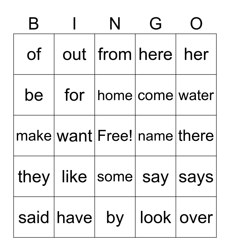 This bingo card has a free space and 24 words: like, have, home, said, her, of, be, out, name, some, come, make, say, says, for, look, there, from, water, want, over, they, here and by.