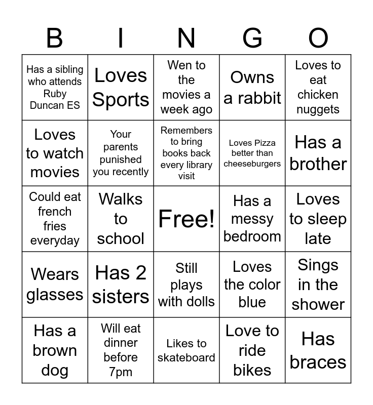 This bingo card has a free space and 24 words: Has 2 sisters, Will eat dinner before 7pm, Remembers to bring books back every library visit, Has a brown dog, Loves to eat chicken nuggets, Has a sibling who attends Ruby Duncan ES, Loves to watch movies, Loves Sports, Has a messy bedroom, Still plays with dolls, Loves Pizza better than cheeseburgers, Could eat french fries everyday, Loves the color blue, Sings in the shower, Your parents punished you recently, Love to ride bikes, Loves to sleep late, Wen to the movies a week ago, Has a brother, Walks to school, Has braces, Wears glasses, Owns a rabbit and Likes to skateboard.