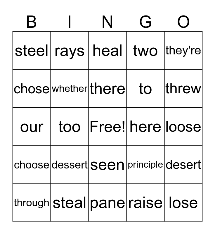 This bingo card has a free space and 38 words: see, sea, weather, whether, desert, dessert, there, their, they're, to, too, two, lose, loose, chose, choose, heel, heal, hear, here, steel, steal, threw, through, pain, pane, piece, peace, write, right, scene, seen, raise, rays, principal, principle, our and hour.
