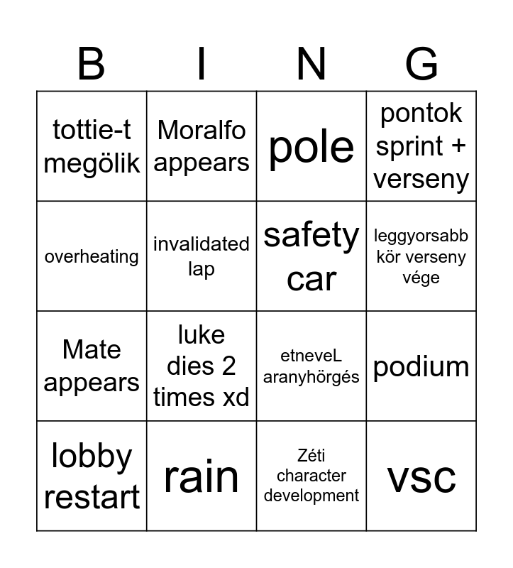 This bingo card has 16 words: rain, podium, pole, tottie-t megölik, Mate appears, Moralfo appears, etneveL aranyhörgés, Zéti character development, overheating, invalidated lap, lobby restart, pontok sprint + verseny, luke dies 2 times xd, leggyorsabb kör verseny vége, safety car and vsc.