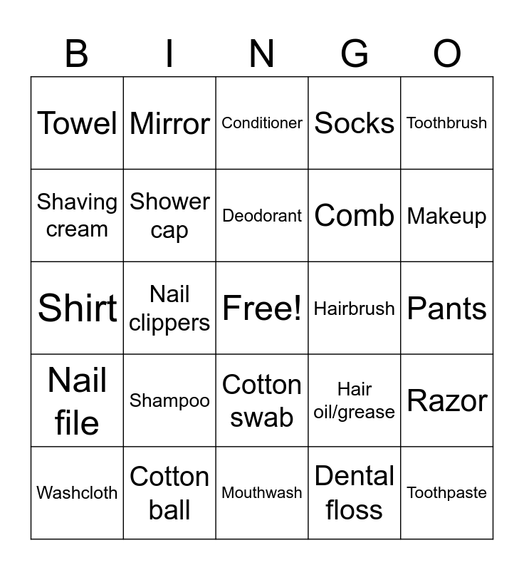 This bingo card has a free space and 24 words: Shampoo, Cotton ball, Deodorant, Washcloth, Toothbrush, Towel, Shaving cream, Mirror, Hairbrush, Cotton swab, Comb, Shirt, Hair oil/grease, Razor, Shower cap, Dental floss, Pants, Conditioner, Makeup, Nail clippers, Toothpaste, Nail file, Socks and Mouthwash.