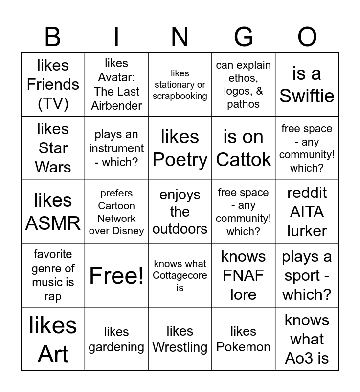This bingo card has 25 words: Free!, likes Wrestling, likes Poetry, likes Art, is a Swiftie, likes Friends (TV), likes Star Wars, likes Avatar: The Last Airbender, free space - any community! which?, knows what Cottagecore is, is on Cattok, likes ASMR, knows FNAF lore, plays a sport - which?, plays an instrument - which?, knows what Ao3 is, reddit AITA lurker, likes stationary or scrapbooking, free space - any community! which?, prefers Cartoon Network over Disney, enjoys the outdoors, likes gardening, favorite genre of music is rap, can explain ethos, logos, & pathos and likes Pokemon.