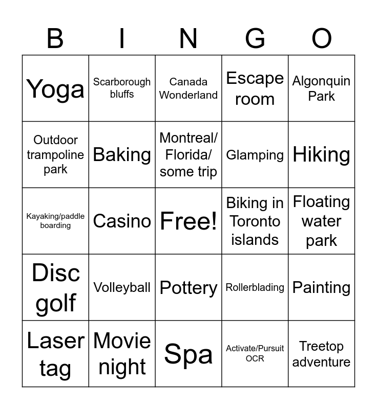 This bingo card has a free space and 24 words: Volleyball, Movie night, Montreal/ Florida/ some trip, Laser tag, Algonquin Park, Yoga, Outdoor trampoline park, Scarborough bluffs, Biking in Toronto islands, Pottery, Glamping, Kayaking/paddle boarding, Rollerblading, Painting, Baking, Activate/Pursuit OCR, Floating water park, Canada Wonderland, Hiking, Casino, Treetop adventure, Disc golf, Escape room and Spa.