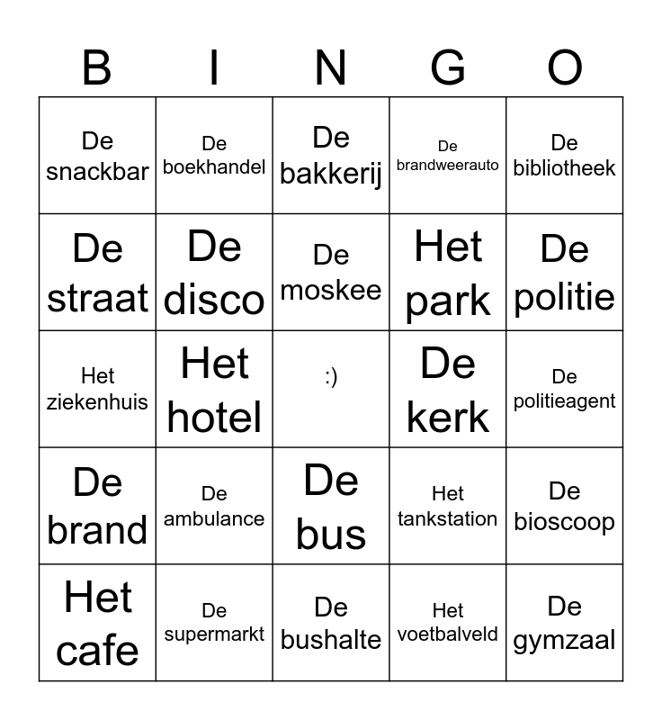 This bingo card has a free space and 29 words: De winkel, De supermarkt, De bakkerij, De slagerij, De bibliotheek, De snackbar, De disco, De moskee, De kerk, De bioscoop, Het cafe, Het hotel, Het voetbalveld, De gymzaal, Het ziekenhuis, Het station, De bushalte, Het tankstation, De politie, De brand, De ambulance, De brandweer, Het park, De politieagent, De straat, De boekhandel, De bus, De brandweerauto and De brandweerman.
