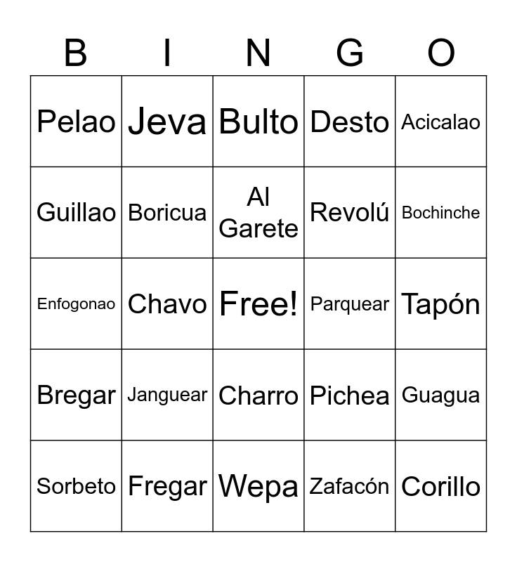 This bingo card has a free space and 28 words: Guagua, Pana, Revolú, Zafacón, Guillao, Bulto, Jeva, Bregar, Parquear, Sorbeto, Enfogonao, Desto, Fregar, Wepa, Bochinche, Nítido, Janguear, Boricua, Al Garete, Charro, Pelao, Guineo, Corillo, Chavo, Tapón, Pichea, Acicalao and Piragua.
