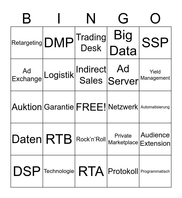 This bingo card has a free space and 25 words: RTB, RTA, Indirect Sales, DSP, SSP, Retargeting, Ad Exchange, DMP, Netzwerk, Rock’n’Roll, Ad Server, Auktion, Private Marketplace, Audience Extension, Logistik, Effizienz, Automatisierung, Trading Desk, Yield Management, Garantie, Programmatisch, Technologie, Daten, Big Data and Protokoll.