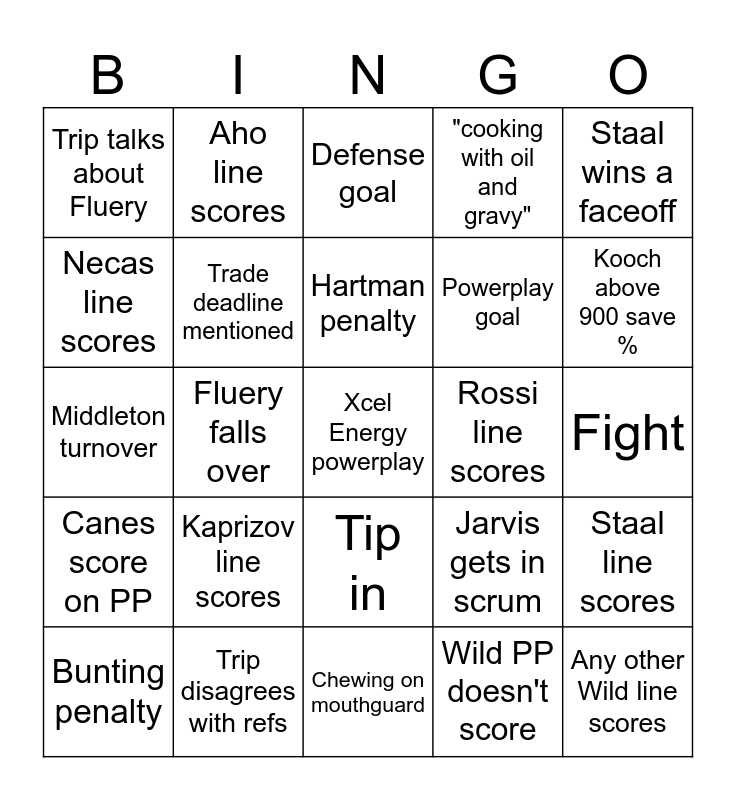 This bingo card has a free space and 24 words: Kaprizov line scores, Trip disagrees with refs, Hartman penalty, Bunting penalty, Staal wins a faceoff, Trip talks about Fluery, Necas line scores, Aho line scores, Rossi line scores, Tip in, Powerplay goal, Middleton turnover, Jarvis gets in scrum, Staal line scores, Trade deadline mentioned, Wild PP doesn't score, Fight, Defense goal, Kooch above 900 save %, Fluery falls over, Any other Wild line scores, Canes score on PP, "cooking with oil and gravy" and Chewing on mouthguard.
