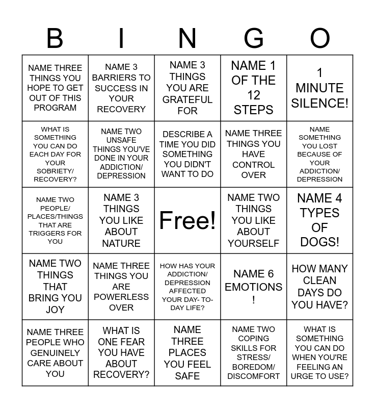 This bingo card has a free space and 28 words: HOW MANY CLEAN DAYS DO YOU HAVE?, WHAT RECOVERY TOOLS HAVE YOU FOUND MOST HELPFUL?, NAME THREE THINGS YOU HAVE CONTROL OVER, NAME TWO COPING SKILLS FOR STRESS/ BOREDOM/ DISCOMFORT, WHAT IS SOMETHING YOU CAN DO EACH DAY FOR YOUR SOBRIETY/ RECOVERY?, NAME 3 THINGS YOU ARE GRATEFUL FOR, NAME 3 BARRIERS TO SUCCESS IN YOUR RECOVERY, NAME TWO THINGS THAT BRING YOU JOY, NAME TWO THINGS YOU LIKE ABOUT YOURSELF, NAME THREE PEOPLE WHO GENUINELY CARE ABOUT YOU, NAME TWO PEOPLE/ PLACES/THINGS THAT ARE TRIGGERS FOR YOU, NAME 1 OF THE 12 STEPS, WHAT IS ONE FEAR YOU HAVE ABOUT RECOVERY?, NAME THREE PLACES YOU FEEL SAFE, NAME SOMETHING YOU LOST BECAUSE OF YOUR ADDICTION/ DEPRESSION, WHAT IS YOUR DEFINITION OF RECOVERY?, NAME THREE THINGS YOU ARE POWERLESS OVER, NAME TWO UNSAFE THINGS YOU'VE DONE IN YOUR ADDICTION/ DEPRESSION, DESCRIBE A TIME YOU DID SOMETHING YOU DIDN'T WANT TO DO, HOW HAS YOUR ADDICTION/ DEPRESSION AFFECTED YOUR DAY- TO- DAY LIFE?, NAME THREE THINGS YOU HOPE TO GET OUT OF THIS PROGRAM, WHAT IS SOMETHING YOU CAN DO FOR RELAXATION?, WHAT IS SOMETHING YOU CAN DO WHEN YOU'RE FEELING AN URGE TO USE?, NAME 3 THINGS YOU LIKE ABOUT NATURE, NAME 4 TYPES OF DOGS!, NAME 6 EMOTIONS !, 1 MINUTE SILENCE! and WHAT CHARACTER FROM A KIDS MOVIE DO YOU RELATE TO?.