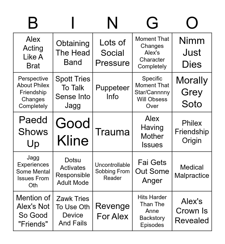 This bingo card has a free space and 24 words: Dotsu Activates Responsible Adult Mode, Zawk Tries To Use Oth Device And Fails, Puppeteer Info, Mention of Alex's Not So Good "Friends", Nimm Just Dies, Alex Acting Like A Brat, Perspective About Philex Friendship Changes Completely, Obtaining The Head Band, Alex Having Mother Issues, Uncontrollable Sobbing From Reader, Specific Moment That Star/Cannnny Will Obsess Over, Paedd Shows Up, Fai Gets Out Some Anger, Medical Malpractice, Spott Tries To Talk Sense Into Jagg, Hits Harder Than The Anne Backstory Episodes, Philex Friendship Origin, Lots of Social Pressure, Morally Grey Soto, Good Kline, Alex's Crown Is Revealed, Jagg Experiences Some Mental Issues From Oth, Moment That Changes Alex's Character Completely and Revenge For Alex.