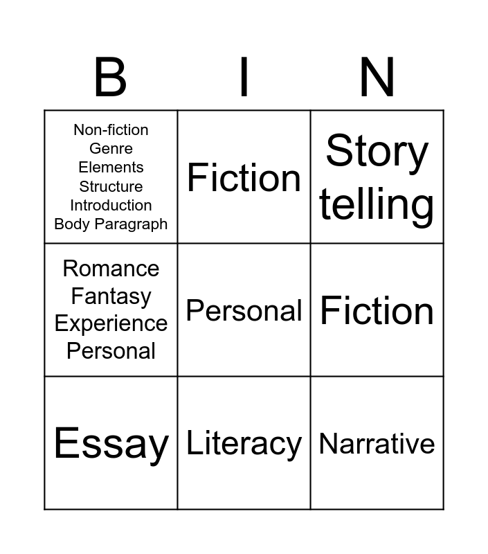 This bingo card has a free space and 11 words: Memoir, Literacy, Narrative, Essay, Fiction, Story telling, Fiction, Horror, Romance Fantasy Experience Personal, Non-fiction Genre Elements Structure Introduction Body Paragraph and Theme Storytelling Unique Plot Characters Setting.