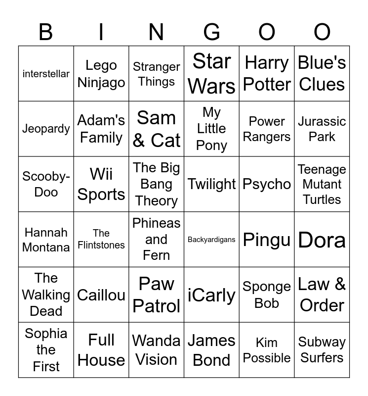 This bingo card has 36 words: iCarly, Paw Patrol, James Bond, Jeopardy, Hannah Montana, Twilight, Adam's Family, Wanda Vision, Harry Potter, Sponge Bob, Jurassic Park, Star Wars, Law & Order, Wii Sports, My Little Pony, interstellar, The Walking Dead, Psycho, Scooby-Doo, Stranger Things, The Big Bang Theory, The Flintstones, Backyardigans, Phineas and Fern, Pingu, Lego Ninjago, Power Rangers, Full House, Sam & Cat, Blue's Clues, Subway Surfers, Sophia the First, Dora, Teenage Mutant Turtles, Caillou and Kim Possible.