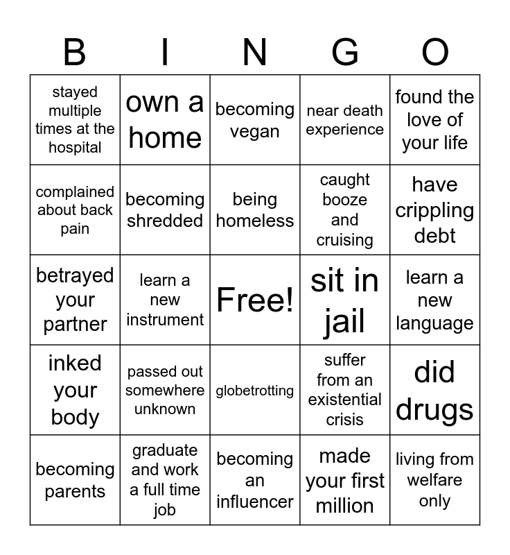 This bingo card has a free space and 24 words: passed out somewhere unknown, graduate and work a full time job, being homeless, becoming parents, found the love of your life, stayed multiple times at the hospital, complained about back pain, own a home, sit in jail, globetrotting, caught booze and cruising, betrayed your partner, suffer from an existential crisis, did drugs, becoming shredded, made your first million, learn a new language, becoming vegan, have crippling debt, learn a new instrument, living from welfare only, inked your body, near death experience and becoming an influencer.