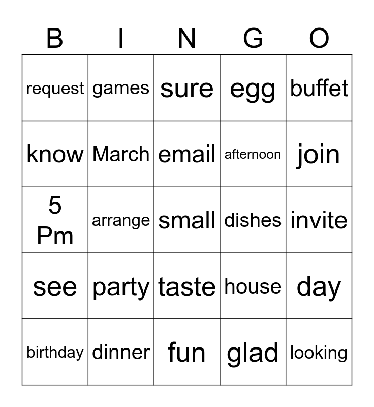 This bingo card has a free space and 24 words: party, dinner, email, birthday, buffet, request, know, games, dishes, taste, afternoon, 5 Pm, house, day, March, glad, invite, sure, join, arrange, looking, see, egg and fun.