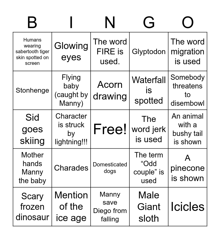 This bingo card has a free space and 69 words: Spot a fox, An animal with a bushy tail is shown, Glacial movement, A Wooly Mammoth, Mention of the ice age, The word extinction is used, Glyptodon, The word fungus is used, The word migration is used, A dandelion, A pinecone is shown, An animal decides not to go south (decides to go north), Humans wearing sabertooth tiger skin spotted on screen, The word FIRE is used., Its raining, Character is struck by lightning!!!, Domesticated dogs, Waterfall is spotted, Necklace with seashells, Mother hands Manny the baby, The word jerk is used, The term “Odd couple” is used, Somebody threatens to disembowl, Sid does an impression of another character, Glacier pass is mentioned, Diaper change, Dodo birds!!!, Melon football, Male Giant sloth, Sabertooth tigers, Glowing eyes, Female Giant sloth, Timeout is mentioned, Sid playing dead, It’s Snowing, Steam geyser, Redlight greenlight, Snowball, Stonhenge, Ice skating, Charades, Icicles, A “shortcut” is mentioned, Sid gets seperated from the group, Scary frozen fish, Scary frozen dinosaur, Evolution of Sid, UFO in ice, Frozen slip and slide, Flying baby (caught by Manny), Acorn drawing, Picture of a mammoth family, LAVA!!!, Manny save Diego from falling, A campfire, Sid’s tail catches fire, Baby’s first steps, Pop-acrorn, Ambush mentioned, Sid goes skiing, Sabertooth cat fight, Diego left behind, Sid feints, Baby reunited with his father, Game of Peekaboo, Global warming is mentioned, Scrat thaws out 20,000 years later, Scrat finds a coconut and Volcano erupts.