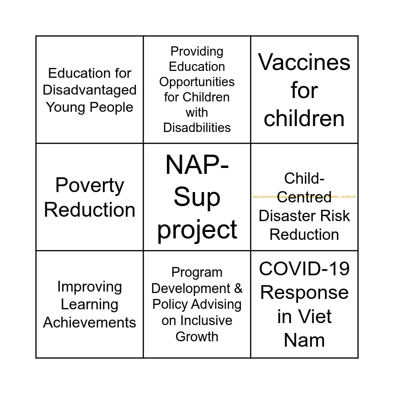 This bingo card has 1 images, a free space and 8 words: Child-Centred Disaster Risk Reduction, Vaccines for children, Providing Education Opportunities for Children with Disadbilities, Improving Learning Achievements, Education for Disadvantaged Young People, COVID-19 Response in Viet Nam, Poverty Reduction and Program Development & Policy Advising on Inclusive Growth.