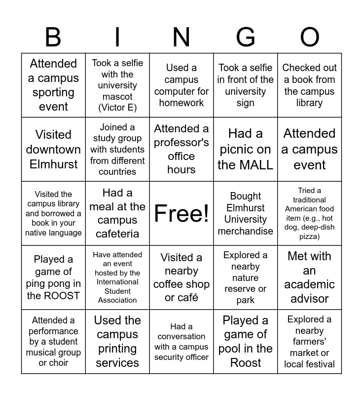 This bingo card has a free space and 24 words: Have attended an event hosted by the International Student Association, Used the campus printing services, Attended a professor's office hours, Attended a performance by a student musical group or choir, Checked out a book from the campus library, Attended a campus sporting event, Visited downtown Elmhurst, Took a selfie with the university mascot (Victor E), Bought Elmhurst University merchandise, Visited a nearby coffee shop or café, Had a picnic on the MALL, Visited the campus library and borrowed a book in your native language, Explored a nearby nature reserve or park, Met with an academic advisor, Joined a study group with students from different countries, Played a game of pool in the Roost, Tried a traditional American food item (e.g., hot dog, deep-dish pizza), Used a campus computer for homework, Attended a campus event, Had a meal at the campus cafeteria, Explored a nearby farmers' market or local festival, Played a game of ping pong in the ROOST, Took a selfie in front of the university sign and Had a conversation with a campus security officer.
