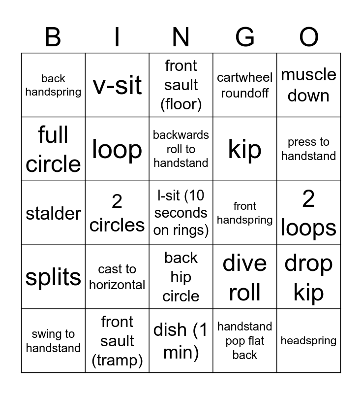 This bingo card has a free space and 24 words: cast to horizontal, front sault (tramp), backwards roll to handstand, swing to handstand, muscle down, back handspring, full circle, v-sit, front handspring, back hip circle, kip, stalder, dive roll, drop kip, loop, handstand pop flat back, 2 loops, front sault (floor), press to handstand, 2 circles, headspring, splits, cartwheel roundoff and dish (1 min).