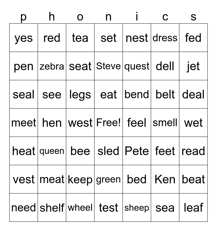 This bingo card has a free space and 48 words: bed, dell, test, hen, legs, wet, red, shelf, dress, sled, fed, set, belt, bend, vest, smell, pen, jet, Ken, nest, quest, west, yes, zebra, beat, seat, deal, need, eat, see, sea, feel, read, meat, meet, Pete, feet, seal, bee, keep, heat, leaf, tea, wheel, Steve, green, queen and sheep.