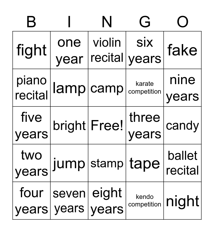 This bingo card has a free space and 28 words: ballet recital, dance competition, karate competition, kendo competition, piano recital, violin recital, one year, two years, three years, four years, five years, six years, seven years, eight years, nine years, ten years, jump, lamp, camp, stamp, fight, light, night, bright, candy, tape, fake and lake.