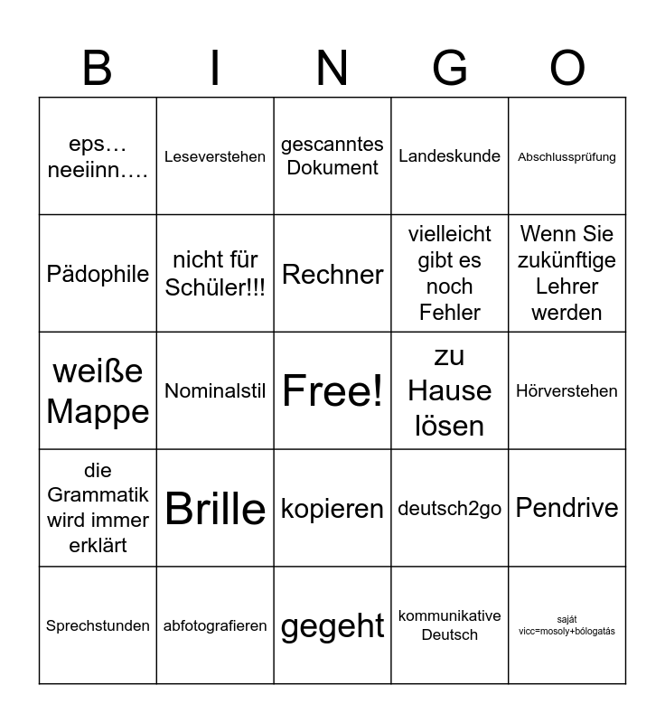 This bingo card has a free space and 24 words: Brille, abfotografieren, Rechner, Sprechstunden, Abschlussprüfung, eps…neeiinn…., Pädophile, Leseverstehen, zu Hause lösen, kopieren, vielleicht gibt es noch Fehler, weiße Mappe, deutsch2go, Pendrive, nicht für Schüler!!!, kommunikative Deutsch, Hörverstehen, gescanntes Dokument, Wenn Sie zukünftige Lehrer werden, Nominalstil, saját vicc=mosoly+bólogatás, die Grammatik wird immer erklärt, Landeskunde and gegeht.