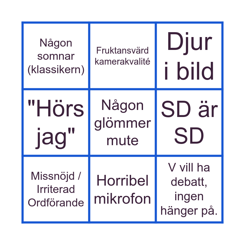 This bingo card has 9 words: Missnöjd / Irriterad Ordförande, Någon glömmer mute, Djur i bild, Någon somnar (klassikern), Fruktansvärd kamerakvalité, SD är SD, "Hörs jag", Horribel mikrofon and V vill ha debatt, ingen hänger på..