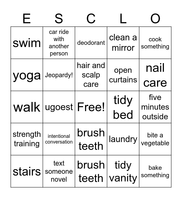 This bingo card has a free space and 35 words: yoga, meal with another person, shower, open curtains, five minutes outside, walk, Jeopardy!, wash face, tidy bed, survived medical appointment, strength training, car ride with another person, tidy floor, no skin picking, swim, intentional conversation, brush teeth, laundry, nail care, stairs, text someone novel, brush teeth, tidy vanity, bite a vegetable, yoga, ugoest, novel skincare, tidy desk, cook something, deodorant, change pillowcase, bake something, hair and scalp care, clean a mirror and play with frog.