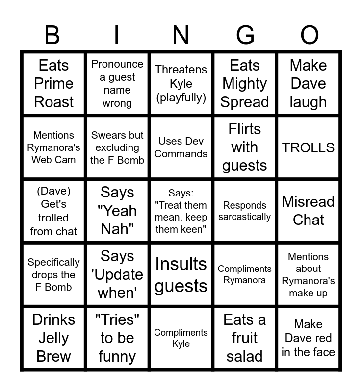 This bingo card has 25 words: Says 'Update when', Compliments Kyle, Uses Dev Commands, Drinks Jelly Brew, Make Dave laugh, Eats Prime Roast, Mentions Rymanora's Web Cam, Pronounce a guest name wrong, Responds sarcastically, Insults guests, Flirts with guests, (Dave) Get's trolled from chat, Compliments Rymanora, Mentions about Rymanora's make up, Swears but excluding the F Bomb, Make Dave red in the face, Misread Chat, Threatens Kyle (playfully), TROLLS, Says "Yeah Nah", Says: "Treat them mean, keep them keen", "Tries" to be funny, Specifically drops the F Bomb, Eats Mighty Spread and Eats a fruit salad.