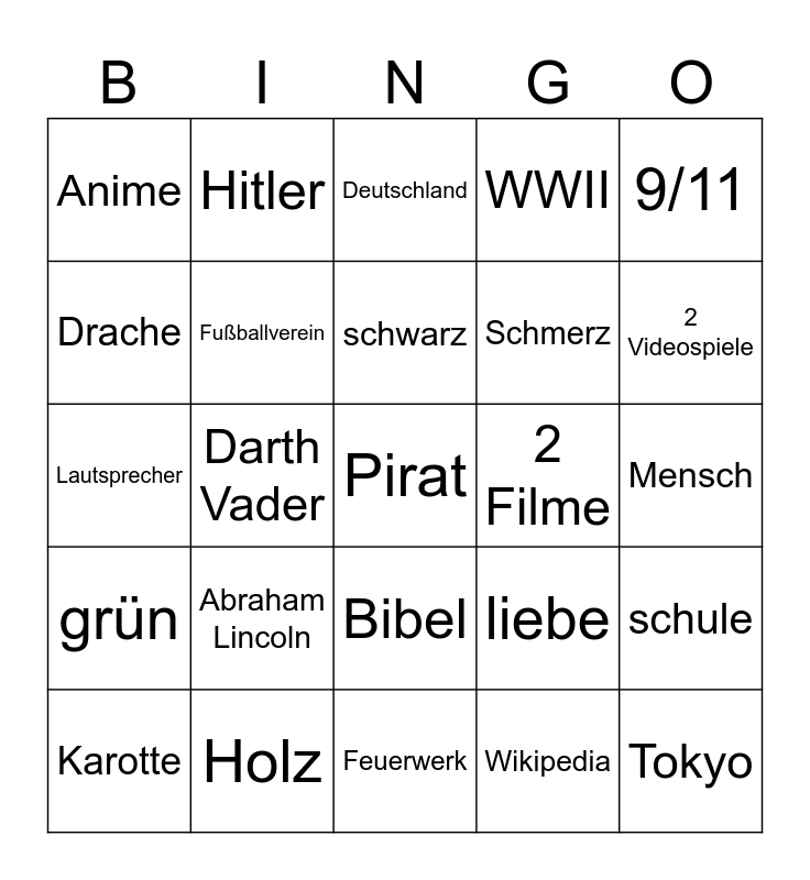 This bingo card has a free space and 29 words: Karotte, Pikachu, Darth Vader, 3 Musik Genres, Anime, Deutschland, Fußballverein, Abraham Lincoln, 2 Filme, Holz, Mensch, Tokyo, Feuerwerk, Wikipedia, 2 Videospiele, Automarke, Bibel, grün, 9/11, Lautsprecher, liebe, Englisch, Schmerz, Drache, WWII, Hitler, schule, schwarz and Zombie.