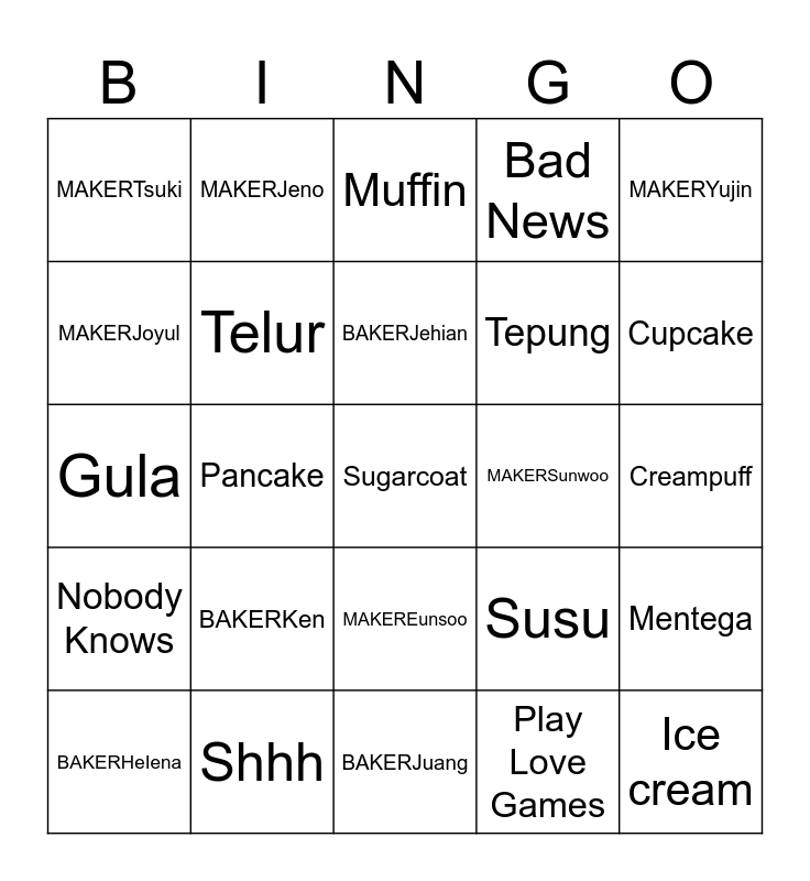 This bingo card has 25 words: BAKERKen, BAKERJuang, BAKERJehian, BAKERHeIena, MAKERYujin, MAKERTsuki, MAKERJoyul, MAKERJeno, MAKERSunwoo, MAKEREunsoo, Tepung, Gula, Susu, Mentega, Telur, Ice cream, Creampuff, Muffin, Cupcake, Pancake, Sugarcoat, Shhh, Nobody Knows, Bad News and Play Love Games.