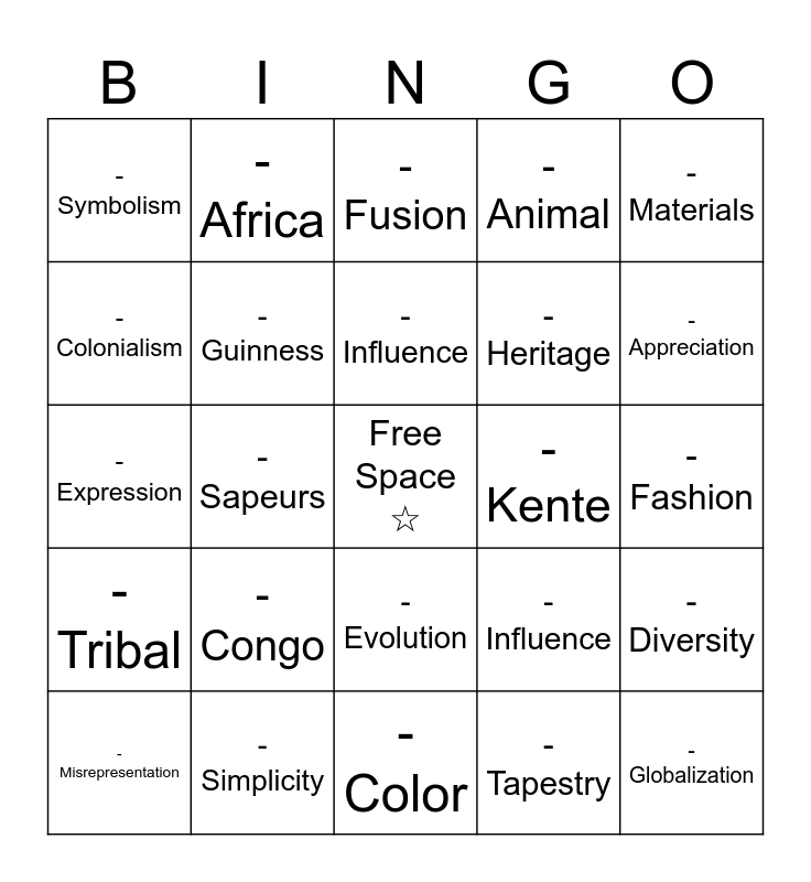This bingo card has a free space and 26 words: - Evolution, - Tapestry, - Influence, - Simplicity, - Materials, - Symbolism, - Colonialism, - Africa, - Fashion, - Influence, - Heritage, - Expression, - Diversity, - Misrepresentation, - Sapeurs, - Geometric, - Animal, - Tribal, - Fusion, - Globalization, - Appreciation, - Color, - Kente, - Congo, - Guinness and - Kaftan.