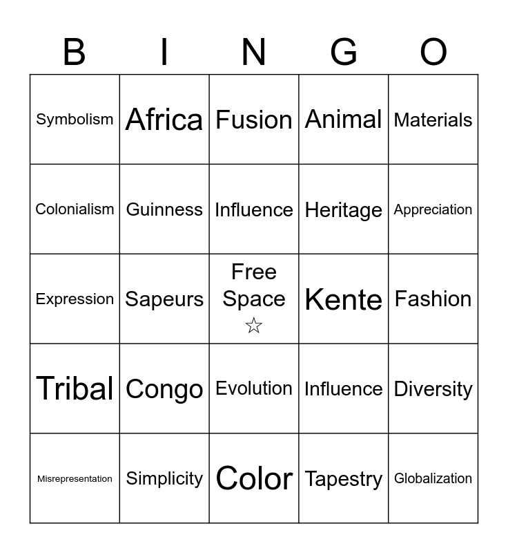 This bingo card has a free space and 26 words: Evolution, Tapestry, Influence, Simplicity, Materials, Symbolism, Colonialism, Africa, Fashion, Influence, Heritage, Expression, Diversity, Misrepresentation, Sapeurs, Geometric, Animal, Tribal, Fusion, Globalization, Appreciation, Color, Kente, Congo, Guinness and Kaftan.