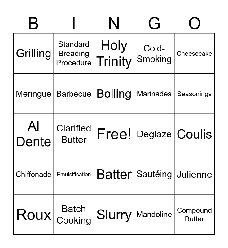This bingo card has a free space and 40 words: Aftertaste, Al Dente, Baking, Barbecue, Batch Cooking, Batter, Boiling, Broiling, Cheesecake, Chiffonade, Clarified Butter, Cold-Smoking, Compound Butter, Coulis, Deglaze, Emulsification, Garnish, Grilling, Herbs, Holy Trinity, Julienne, Mandoline, Marinades, Meringue, Mincing, Mirepoix, Pate a Choux, Pilaf Method, Quiche, Recipe, Recipe Conversion, Roux, Sauce, Sautéing, Seasonings, Slurry, Smoking, Smoking point, Standard Breading Procedure and Steaming.