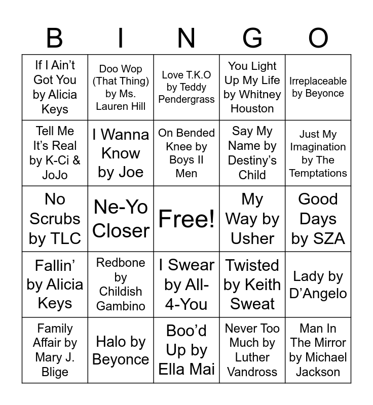 This bingo card has a free space and 25 words: Redbone by Childish Gambino, Boo’d Up by Ella Mai, On Bended Knee by Boys II Men, Family Affair by Mary J. Blige, Irreplaceable by Beyonce, If I Ain’t Got You by Alicia Keys, Tell Me It’s Real by K-Ci & JoJo, Doo Wop (That Thing) by Ms. Lauren Hill, My Way by Usher, I Swear by All-4-You, Say My Name by Destiny’s Child, No Scrubs by TLC, Twisted by Keith Sweat, Lady by D’Angelo, I Wanna Know by Joe, Are You That Somebody by Aaliyah, Good Days by SZA, Love T.K.O by Teddy Pendergrass, Just My Imagination by The Temptations, Ne-Yo Closer, Man In The Mirror by Michael Jackson, Halo by Beyonce, Fallin’ by Alicia Keys, You Light Up My Life by Whitney Houston and Never Too Much by Luther Vandross.