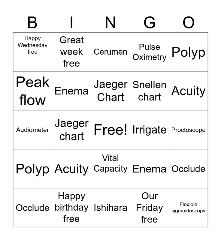 This bingo card has a free space and 24 words: Acuity, Happy birthday free, Jaeger Chart, Occlude, Polyp, Happy Wednesday free, Peak flow, Great week free, Irrigate, Vital Capacity, Snellen chart, Audiometer, Enema, Occlude, Enema, Our Friday free, Proctoscope, Cerumen, Acuity, Jaeger chart, Flexible sigmoidoscopy, Polyp, Pulse Oximetry and Ishihara.