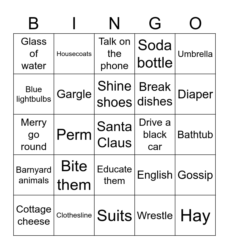 This bingo card has 25 words: Bite them, Suits, Shine shoes, Cottage cheese, Umbrella, Glass of water, Blue lightbulbs, Housecoats, Drive a black car, Educate them, Break dishes, Merry go round, English, Gossip, Gargle, Hay, Bathtub, Talk on the phone, Diaper, Perm, Santa Claus, Clothesline, Barnyard animals, Soda bottle and Wrestle.